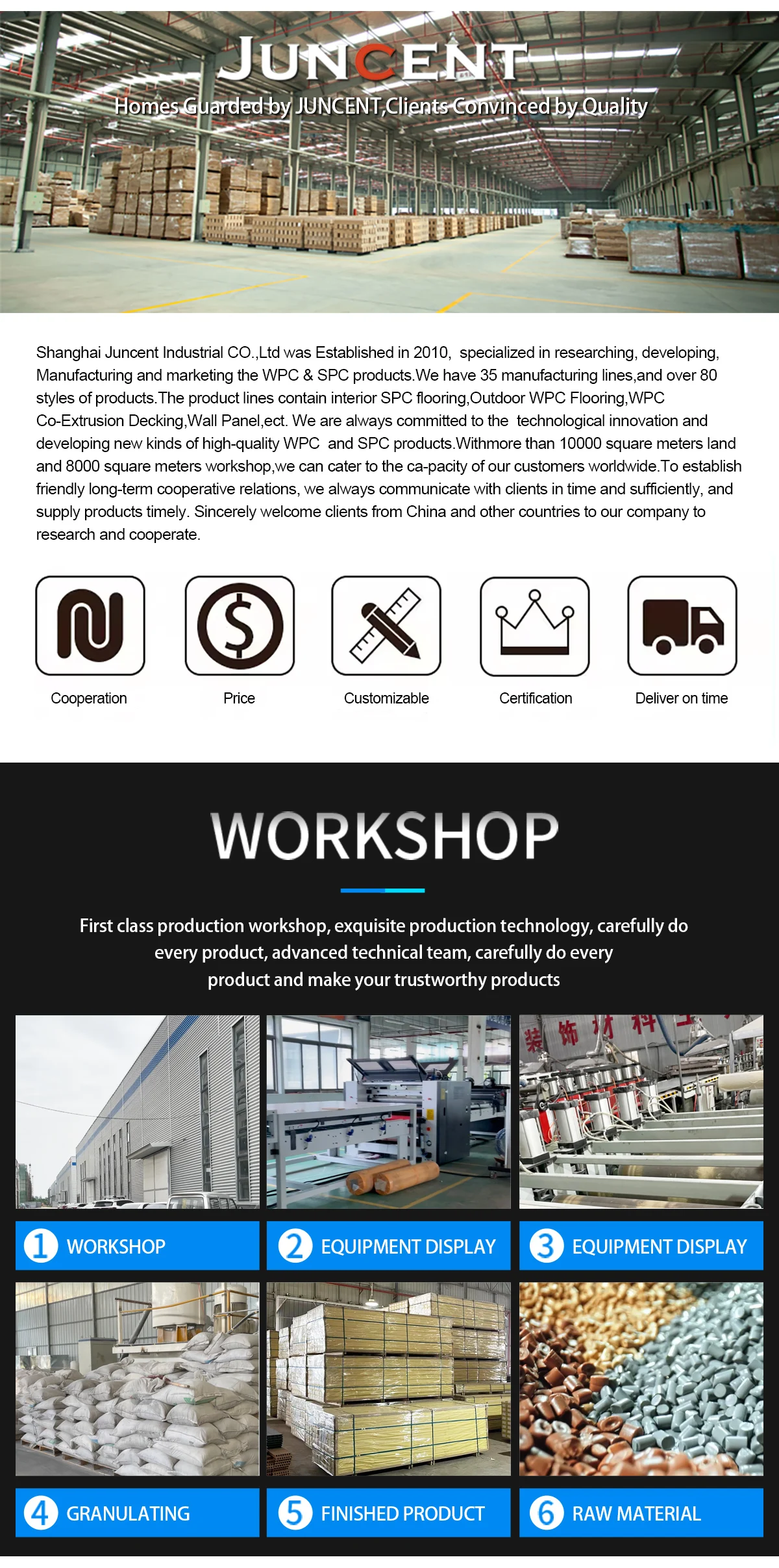 Q1: We are based in Shanghai, China, start from 2010, specialized in researching, developing,Manufacturing and marketing the WPC &SPC products.We have 35 manufacturing lines,and over 80 styles of products.We are always committed to the technological innovation